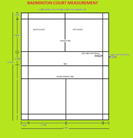 Badminton court is in rectangular shape It is divided into two halves measuring 6.7m each and it is separated by badminton net that stand height is 1.55m at the ends and dips to 1.52m in the middle . court total length is 13.41M and Width is 6.1M . The two playing areas of either side in vertically divided down the middle after net the first line is short service line and distance between them is 1.98M . Then Next line is doubles long service line and distance between short service line and doubles long service line is 3.96M then next line or base line it is long service line for singles and distance between them is .76M .